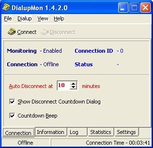 DialupMon is a handy little gadget that disconnects you from the internet after a set time. At the specified time, a disconnect window will appear, if you choose Cancel, you can continue surfing and the program window will reappear later. If you are not at your computer when the program alerts you and offers to disconnect, it will automatically disconnect your connection. DialupMon also displays all connection information.