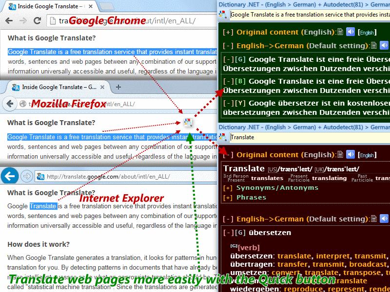 Dictionary .NET is a small and sophisticated multilingual dictionary/translator offering translations from/into 91 languages. This application uses translators such as Google and Bing. Thanks to this you have several useful features at hand such as: translation of selected text using mouse or keyboard shortcuts, automatic complete translation, display of alternative vocabulary, translation of web pages, translation of various documents and many more.