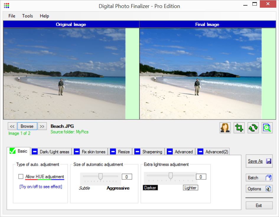 Digital Photo Finalizer helps you get the most out of your digital photos. It analyzes and then automatically edits your digital photos to make them look their best. It crops, resizes, changes the color tones of the photo, etc. Supports JPG, TIFF, PNG or BMP file formats. It is able to automatically save these files to a ZIP archive. During editing, you can see the differences between the original photo and the intermediate image.