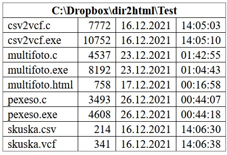I have been working as a programmer for many years. My computer is filled with many folders and files. I have always advocated that it is advisable to have no more than 22 files. This is so that I can see them on the display at the same time. But this is not always the case. So I decided to create a simple program for myself and other programmers. It has no window, no icon and no parameters to set. It does its job and that's it. You can also print a list of files from the dir2html.html file.