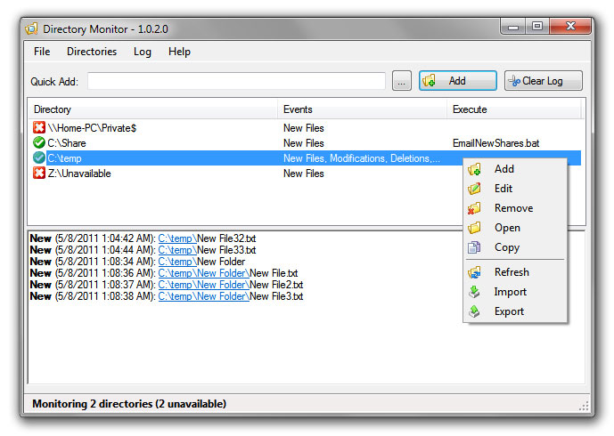 Directory Monitor is used to monitor specific directories and alert you of file changes, deletions, modifications to files, and the addition of new files in real time. It supports selecting the folders to be monitored. It monitors local directories or shared network folders. When any change is made, it will display a notification in a bubble. Directory Monitor runs as a Windows service.