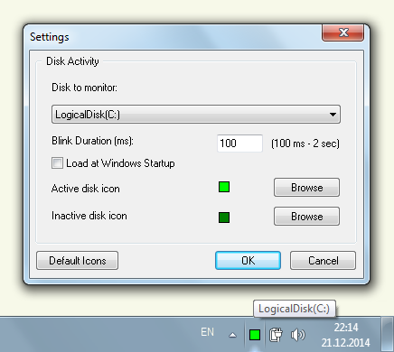 Disk Activity Indicator can be useful if your computer does not have HDD LED (laptop/ultrabook) or if you are connected to a remote computer using RDP or VNC/RFB applications. When the Settings dialog opens, you can select which logical or hard drives you want to monitor, then specify the update interval, and finally customize the icon.
