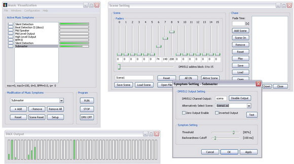 This program can create a complete light show based only on the music currently playing. Any lighting equipment that supports DMX512 can be controlled. Music analysis can be done in the background via microphone, line input or from any application such as Windows Media Player, WinAmp and others.