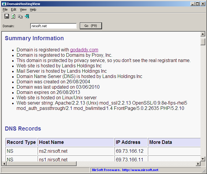 DomainHostingView is a Windows tool that collects extensive domain information using a series of DNS and WHOIS queries, generating HTML reports that can be viewed in any web browser.