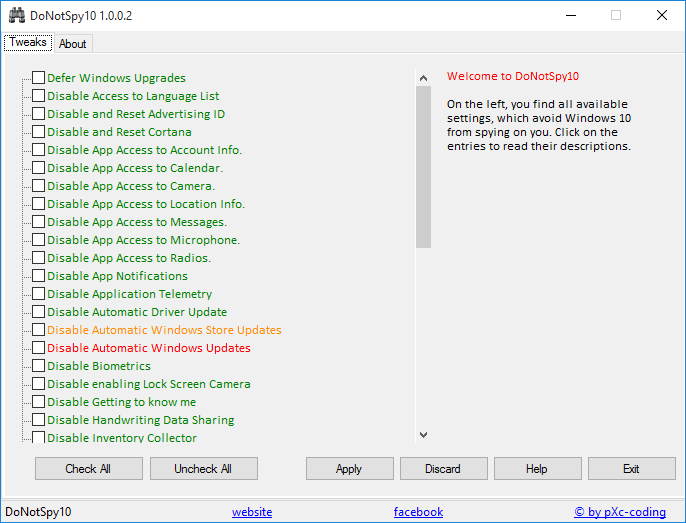DoNotSpy10 allows you to disable certain features in Windows 10, such as automatic system updates, biometrics, or Lock Screen camera features. The program lists all the options that can be tweaked, each of which has a checkbox right next to it. The column on the left side contains short descriptions or definitions for each of the options to tweak.