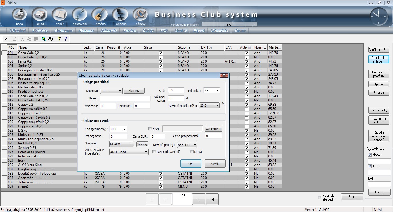 Easy and friendly environment offering all functions such as stock subtraction, possibility to define the composition of meals, cocktails. Mirror, inventory. Easy editing of the composition of individual price list items (e.g. CubaLibre = 0.05 x Havana + 0.01 x Limetsirup + 0.3 x Cola). In the checkout, price list section, there is the possibility to set special prices for employees (staff prices). Checkout also includes clear normalization. Calculation of food, cocktails. Evidence also via EAN codes and subsequent sales, printing of codes, EAN editor.