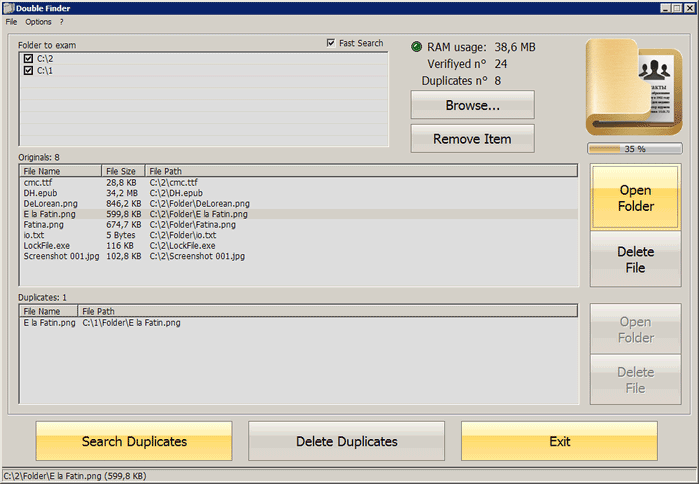 Double Finder is a program for finding duplicates, i.e. duplicate files that are taking up unnecessary disk space.