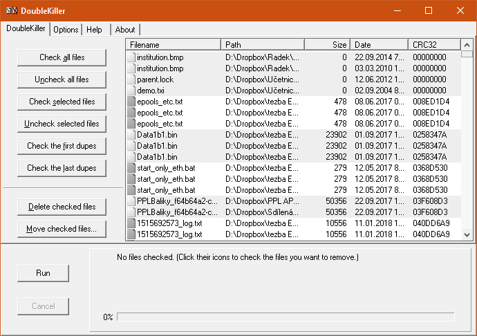 DoubleKiller is a small helper for finding the same files in the specified directory, you can select duplicate files you want to delete by double clicking on its icon, a cross will appear and then you can delete the selected file from the disk with the button.