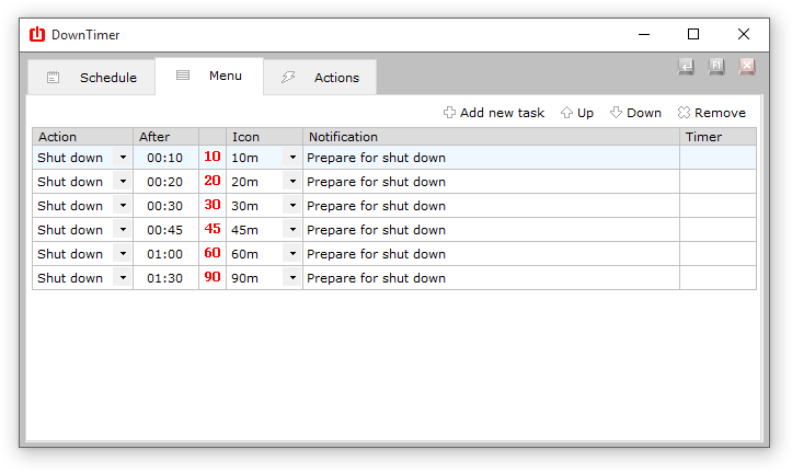 DownTimer is a small utility that is used to automatically shut down a PC. You can set the shutdown intervals. You can activate the timer with a keyboard shortcut.