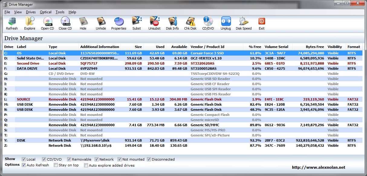 Drive Manager helps you easily identify drives and view their volume nameplate in Windows. It also displays information about the manufacturer of CD/DVD drives and removable drives. You can then distinguish USB memory drives by manufacturer and product ID. Drive Manager also allows you to, for example, hide or replace drive letters for folders and information on the drive.