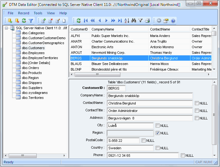 DTM Data Editor is a data viewer and editor for database professionals who need a useful tool for direct database access. The program uses a form-based interface and works with any ODBC, IDAPI and OLE DB data source, as well as desktop oubors such as Microsoft Access. All required SQL statements are generated automatically and can be modified later. For tables that have foreign key - primary key sessions, there are options to manually enter values or select them from a list, which is much faster.