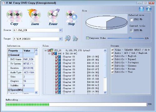 E.M. Free DVD Copy is an efficient and useful DVD backup tool. With this program, you can easily copy and burn your DVDs at high speed and in great quality. It can convert DVD to all popular video and audio formats , such as: AVI, MPEG, WMV, DivX,MOV, 3GP,MP3, WAV, WMA, AAC, AC3, M4A, OGG etc.