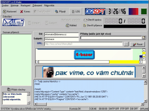 The system is designed to send e-mail messages to a group of addresses (TXT, SMS, ICQ and EAD formats). Each message can be set according to the given criteria. The system can also insert the recipient's email address, header, footer, signature, subject and body into each message separately. Each message can thus become completely different and personalized to a specific recipient.