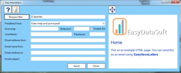 The Easy Newsletters program allows you to easily send a newsletter produced in HTML format. You can send it to Gmail, Yahoo, Hotmail or to your own SMTP server.