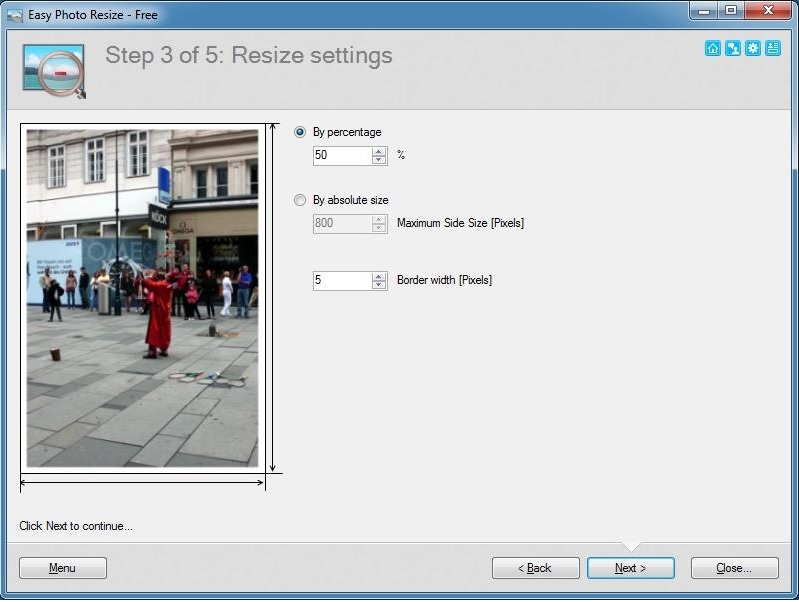 The program is designed to resize multiple images at once (bulk processing). With it you can easily resize your images. As is well known, high quality images have larger file size. Therefore, this program is also suitable for printing them or viewing them in detail. The user interface of the program is designed as a "step by step" guide. In just three steps, you will easily control the resizing. Another advantage of this program is its image processing speed, which will pleasantly surprise you.