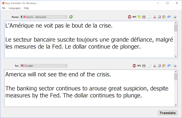 Easy Translator uses an online translator to translate into foreign languages. The program environment is simple, divided into two windows. In one window is the original and in the other the translation.
