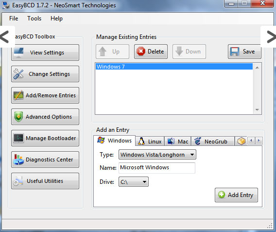 The EasyBCD program is used to modify and fine-tune the Windows Vista and Windows 7 bootloader. It offers simple setup and configuration of items in the bootloader. Bootloaders can be added for other systems such as Linux, Mac OS X, BSD.
