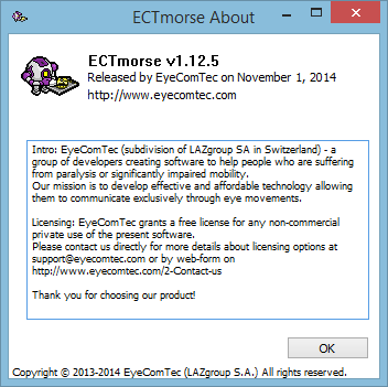 ECTmorse is a program designed to help people suffering from a form of paralysis to communicate by writing using a universal language - Morse code. The program can be used on almost any PC or laptop as it has low system requirements. The program includes extensive settings using keyboard shortcuts to make it as user-friendly as possible. The user manual gives more hints.