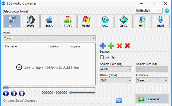 EDS Audio Converter is a tool for converting audio formats. It integrates an option to merge all audio files into one point, as well as a built-in player is available for previewing. The interface is user-friendly, consisting of a normal window with an organized structure where you can add files using the file browser or folder view. Batch processing is supported. In addition to selecting the output format and directory, you can choose a preset profile or adjust audio settings, sample rate and size, bit rate and channel mode.
