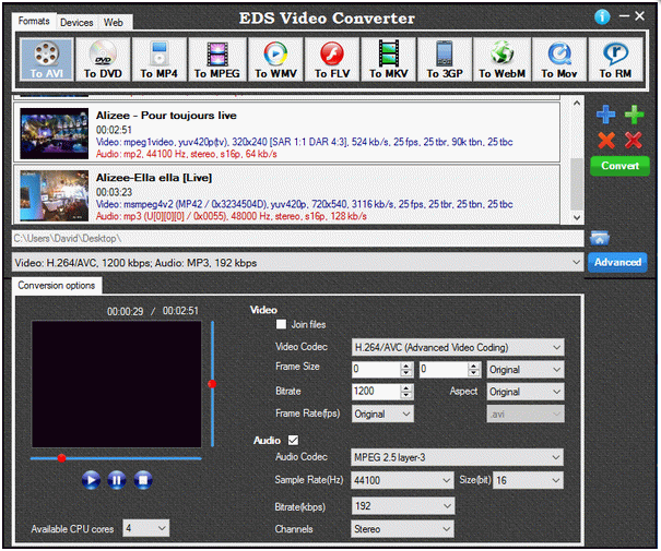 EDS Video Converter is a tool to convert various video format. In addition to selecting the output format and directory, you can also choose a preset profile or adjust video settings in terms of bitrate, size, etc. The tool also integrates an option to merge all video files into one, as well as includes a built-in viewer. Supported formats include HD Video (INC. Blu-ray video, AVCHD, MPEG-2 HD and WMV HD), AVI (DivX, Xvid, etc.), DV AVI, MP4 (INC. Apple iPad, Android tablets and Sony PSP), WMV, 3GP, 3G2, QuickTime (MOV, QT), DVD, VOB, VRO, MPEG-1, 2, 4, TOD, MOD, MPG, DAT, VCD, SVCD, Real Video (RM, RMVB), ASF, ASX , MJPEG, H.263, H.264, DVR-MS, MKV, OGM, FLV, F4V, AMV, MTV, TS, M2TS, M2T, MTS, DPG, NSV, FLI, FLC, CDG, PPT, GVI, TRP ., GIF, WTV etc.
