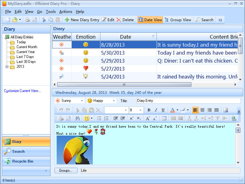 Thanks to its unique and powerful full-text search, you can simply type a word into the diary and quickly find matching entries! The program offers easy import and export of diary entries, backup as well as content encryption. It includes several interface styles.