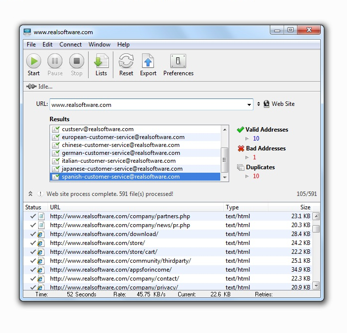 eMail List Builder is a very powerful and reliable tool that allows you to create ready-to-use lists by extracting email addresses from websites and web pages. It can process entire websites or any kind of web pages in no time and extract absolutely all the email addresses they contain.