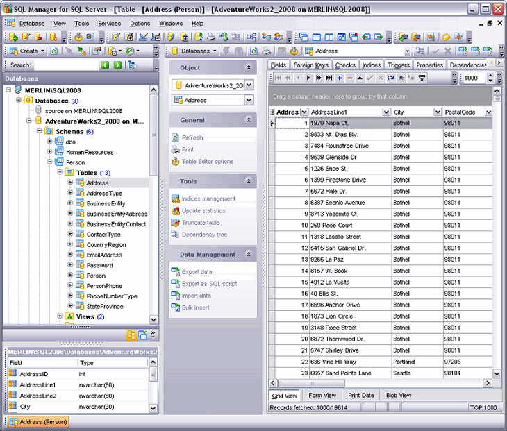 EMS SQL Manager for SQL Server is a powerful graphical tool for Microsoft SQL and MSDE administration. The program allows you to easily and quickly create and edit MS SQL Server database objects, you can run SQL scripts, manage users and their rights, create visible SQL queries, extract, print and search metadata, export data to 15 different formats and import them from the most used formats, preview and edit BLOB fields and much more.