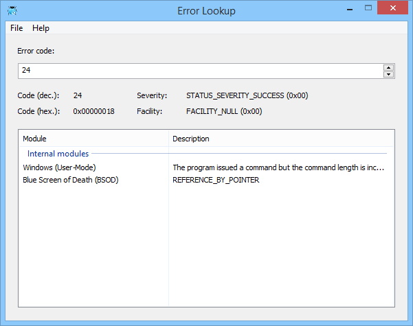 Error Lookup is a program for receiving information about Windows errors. Just enter the error code and then you will get a description of the error.