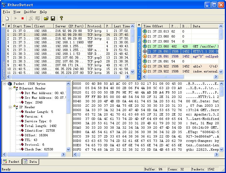 EtherDetect Packet Sniffer is a useful tool for company executives, web designers, concerned parents, LAN administrators, security professionals, C++/Java/ASP/JSP/PHP/SOAP programmers, or anyone interested in the network traffic passing through their computer or their entire LAN. There are many reasons to use EtherDetect Packet Sniffer.