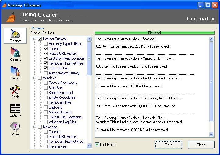 Eusing Cleaner is a free program for optimizing and cleaning your system. It allows you to find and delete unused files, invalid registries, internet history, as well as the history of more than 150 third-party programs.