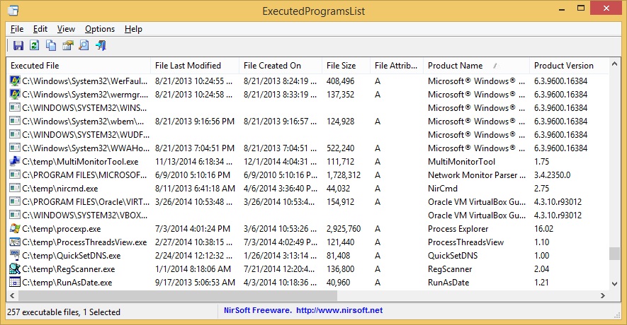 ExecutedProgramsList is a simple tool that displays a list of programs and batch files that you have previously changed on the system. For each program, ExecutedProgramsList displays the EXE file, the EXE file created/modified time, and the current program version information (product name, product version, company name) if available. For some programs, it will also display the time the program was last modified.