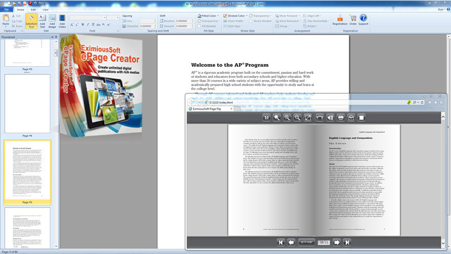 EximiousSoft ePage Creator helps you to create many types of perfect publications like e-books, e-brochures, e-magazines, e-catalog etc, edit digital publications and publish them in PDF, Flash or HTML5 Flipping-books, publications , Mobi, ZIP and EXE format on any computer or mobile device. You can easily create, edit, print and publish any PDF documents. In addition, it allows you to convert PDF files, Microsoft Word documents (docx, doc), RTF documents, TXT files and embedded images, movies, music, hyperlinks, texts, hotspots, even YouTube videos into amazing page turning digital publications, magazines and catalogs etc. After you have created a page-turning, crappy masterpiece in ePage Creator, you can publish it on the web, send it via email, and even distribute it on CD or mobile (Android devices).