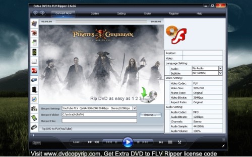 Extra DVD to FLV Ripper is a flexible and simple tool for ripping DVD movies to FLV format without any quality loss. It offers the possibility to set various parameters for output, desired video size, etc. It allows you to monitor the ripping process. It has an intuitive user interface and a modern look.