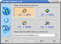 EZ MP3 Creator is a handy tool used to extract digital music from audio CDs, which it encodes into MP3, OGG, WMA or WAV files, with perfect quality and high speed. EZ MP3 Creator has the ability to retrieve CD information such as album, artist and track titles from freedb server over the internet. This information can be saved as MP3 ID3 tags or ogg/WMA comments. The program is very easy to use thanks to the wizard interface.