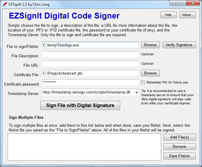 EZSignIt is a free utility that allows you to digitally sign one or more files quickly and easily. It can sign several files at once, remembers the last settings and, unlike other applications, does not depend on other MS tools. You can sign using the graphical user interface or even from the command line. The .PFX or .P12 signature format is supported, and it is also possible to convert SPC/PVK files to this format using a clear tutorial.