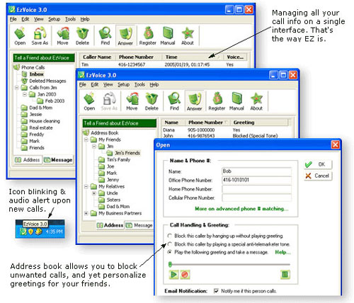 EzVoice is a home voice recorder (phone and email) with many features. It works through your computer and takes phone calls while you are away. This application includes 10 configurable voicemail boxes, graphical email environment, address book manager, double password protected remote message dialing.