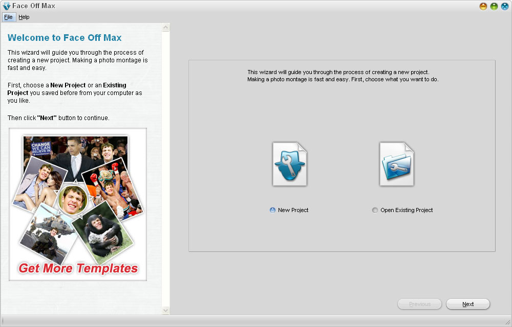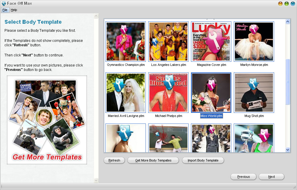 Try Face Off Max! With this program you can easily and quickly create fun photos, for example by putting your face to someone else's body!