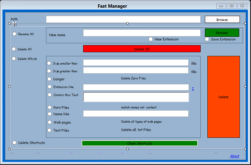 FastManager is a program that allows you to apply bulk edits to a specific group. It can delete all files in a directory, delete shortcuts, delete all text files, no doubt rename all folders. Information and statistics are also available. It can also rename all files according to a predefined pattern, last but not least, it is possible to read information and statistics regarding file types and the amount of folders in directories, or it can delete pictures and videos with erotic themes or files with specific sizes.