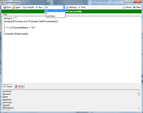 FastSharp is a text editor that allows you to quickly build and run C#, F# and Visual Basic code without opening Visual Studio. The way FastSharp works is very simple. It wraps what you type into a main method, which is then wrapped in a class that then has a list of import declarations attached above it (configurable via the settings dialog). It then compiles the code using which each languageCodeDOM provider executes.