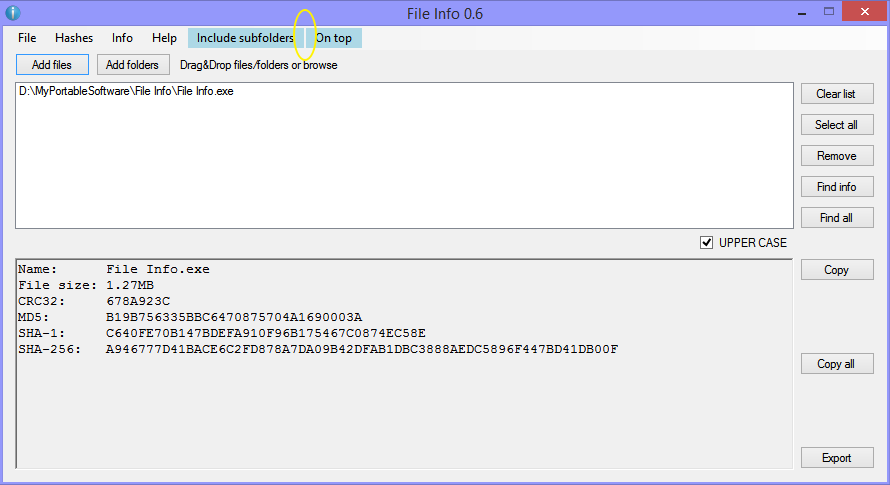 File Info is a software that provides information about CRC32, MD5, SHA-1, SHA-256, SHA-384, SHA-512 files. This information can be modified, specifically (name, size, last modified date).