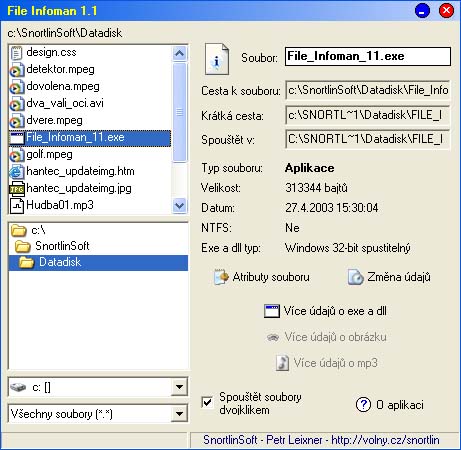 The program lists information about the selected file: name, paths (extended and shortened), associations, icons, type, size, date, attributes, NTFS, extended information about exe, dll, mp3 and images...