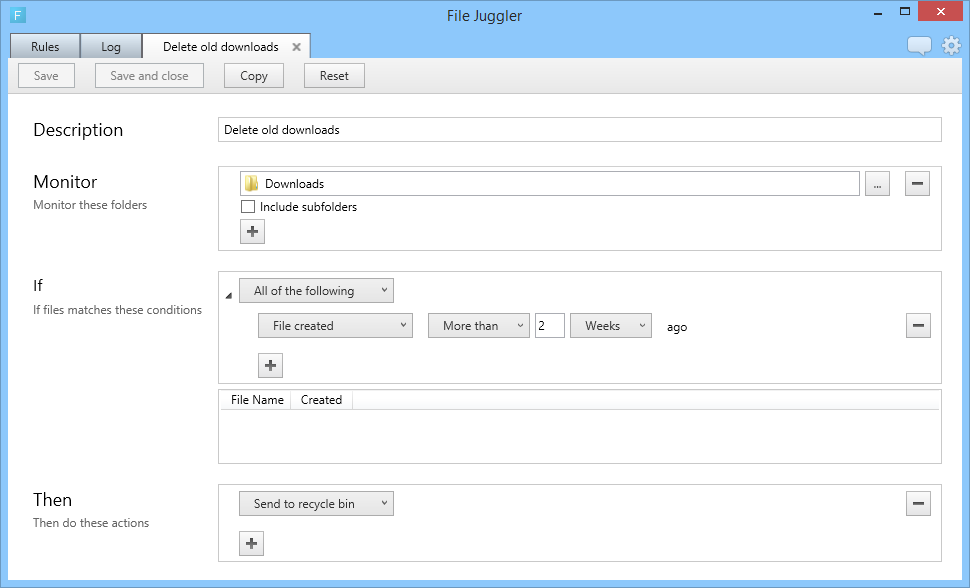 File Juggler is a minimalist application for automating selected file manipulation tasks. By setting rules and conditions, you can configure the behavior of moving, opening, copying, renaming or deleting files.