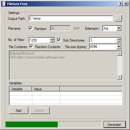 FileGen Free is an application that generates a large number of files for testing. The program is designed to help debug applications that run into problems with large amounts of files on the file system.