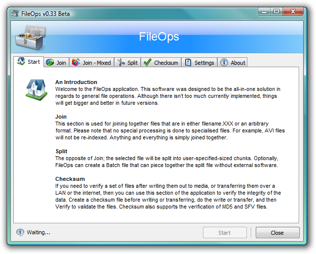 FileOps is an application used for working with files. It allows to merge, split and perform checksum calculation (supports MD5Sum and SFV files). It offers users an intuitive user interface and very simple operation.