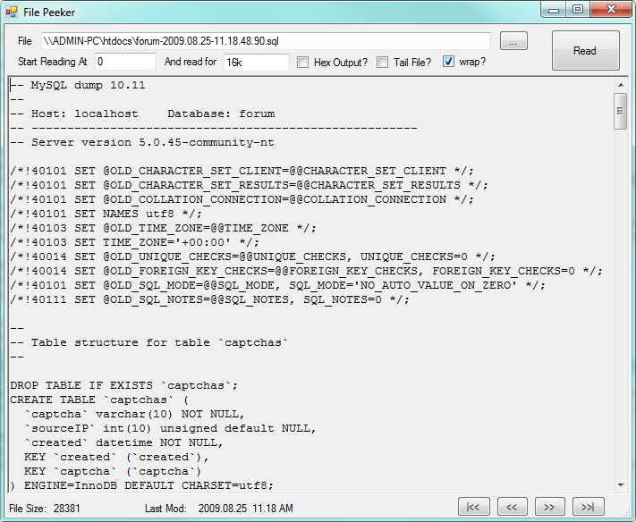 filePeeker is an application that displays the contents of large files (such as database logs). They can be examined through standard mode in hexadecimal output.