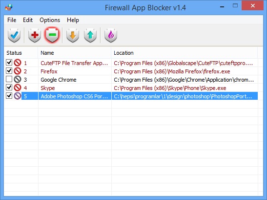Firewall App Blocker is a very easy app, just drag the app you want to block or use the Browse button, select the app to block and that's it. If you want to make the blocked app usable again, just use the Delete button.