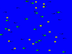 Three types of fish that swim either right to left or left to right at different speeds, adjustable number of fish [1-255] and their maximum speed [1-9].