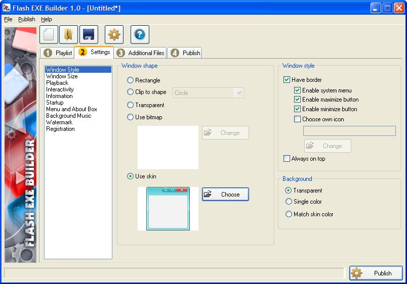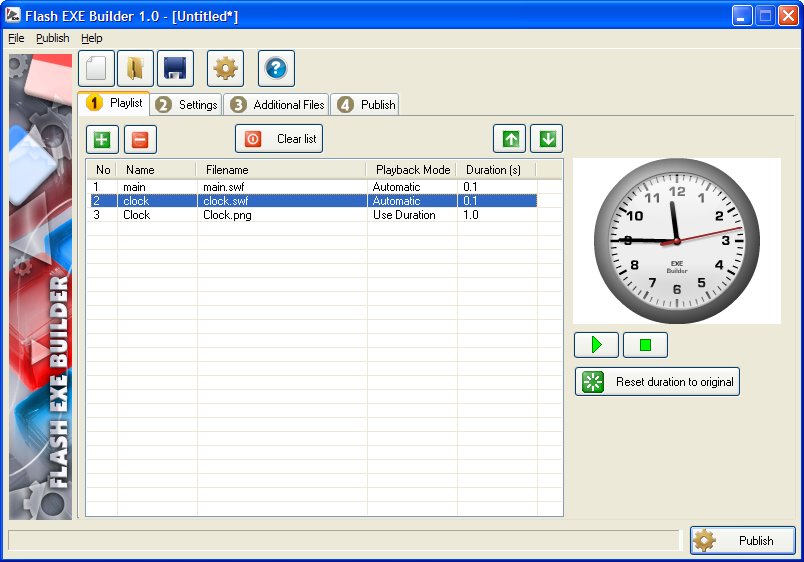 Flash EXE Builder is a tool for quickly converting Flash movie files (.SWF) to executable files (.EXE). It is simple to use, flexible and produces high quality professional output.