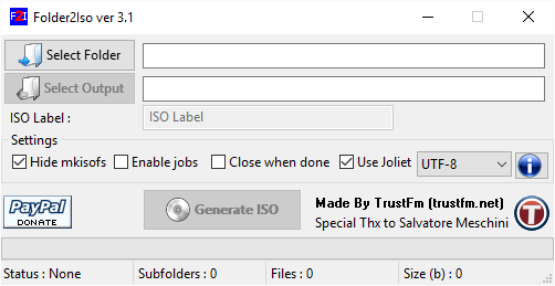 Folder2Iso is a simple tool to create an ISO file from any folder (with subfolders). It is not necessary to install it. It offers a simple interface where you insert the selected folder.