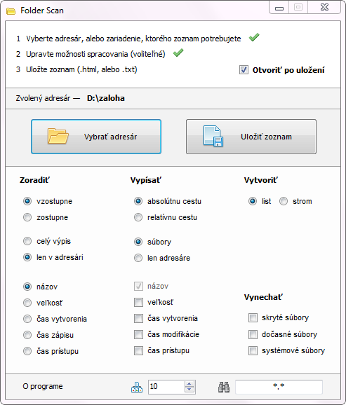 FolderScan will create a list, or the contents of what is in the directory, disk drive or portable media of your choice. The program's uses are wide ranging, from organizing a small card catalog, creating a text list of movies or songs, to creating a DVD address structure that you print on the cover. Operation is quick and easy.